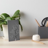 A black and white photograph features a large tree prominently centered against a dark, solid background. The tree's branches are bare and intricate, reaching upwards and outwards in a complex network of limbs. The trunk is thick and textured, appearing sturdy and aged. The background is uniformly dark, making the tree stand out in stark contrast. Smaller, similarly bare branches can be seen along the bottom edge of the frame, suggesting additional trees or shrubbery, but these are less defined and out of focus.</p></p>
